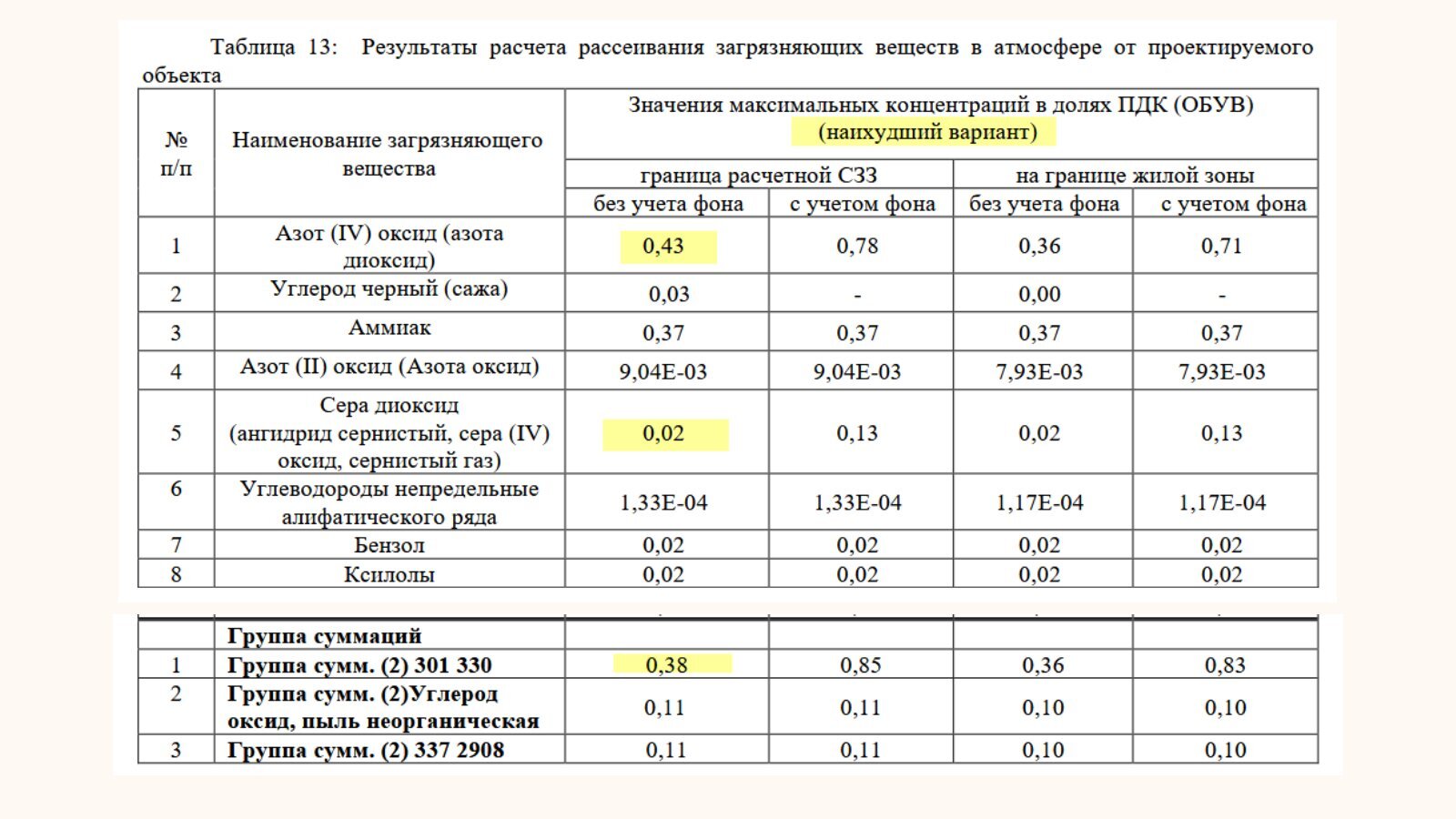 Именно сумма этих двух загрязняющих веществ должна обращать на себя внимание: с учетом другим производств и факторов (фонового загрязнения), их сумма может превысить 100% от ПДК — а по законодательству РБ, это недопустимо в жилых зонах (а ближайшие жилые дома находятся в 517 м от запланированной территории завода).