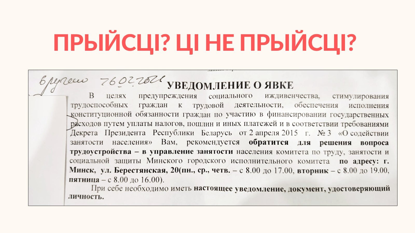 На паперцы пазначана: куды прыходзіць (цэнтр занятасці выканкама), ў якія гадзіны (гадзіны працы Цэнтра), з якімі дакументамі, дата калі дадзенае паведамленне ўручана. Але ці з'явіўся абавязак у чалавека прыйсці ў цэнтр занятасці з-за такой паперы?