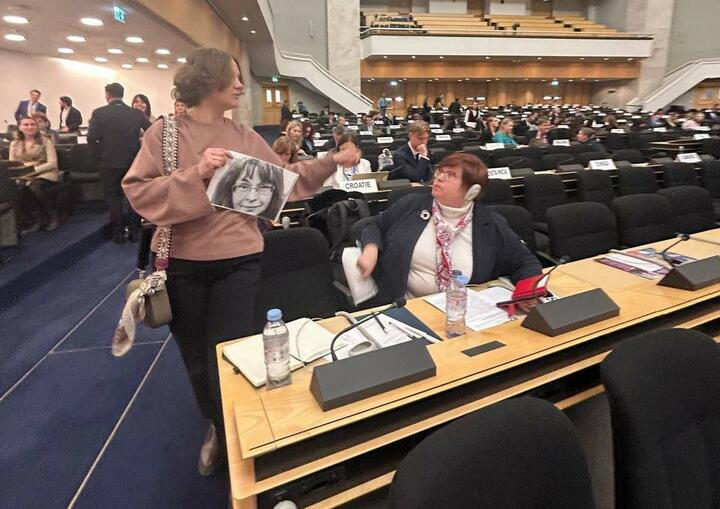 Берасцейка Паліна Шарэнда-Панасюк прынесла на паседжанне ААН партрэты беларускіх палітвязынак